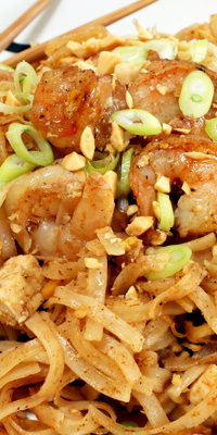 Preparación: hervir los tallarines en agua con sal hasta que estén al dente. Calentar el aceite en una sartén y saltear las lechugas cortadas en tiras muy finas, y la zanahoria rallada. Añadir el tofu en taquitos y los brotes de soja. Al final, agregar las gambas. Cuando comiencen a hacerse, añadir los tallarines y mezclar, y, por último, romper los dos huevos y revolverlos sobre lo anterior. Machacar los anacardos y espolvorear antes de servir.