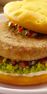 Ingredientes: un bollo de pan integral de 90 grs., 100 grs. de hamburguesa de pollo, 25 grs. de queso Havarti light en lonchas, una rodaja de tomate de 50 grs., 20 grs. de pepinillos en lonchas, una rodaja de cebolla de 40 grs., 30 grs. de aguacate.