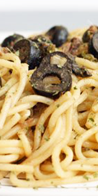 Ingredientes: 180 grs. de espaguetis, 50 grs. netos de salchichas de frankfurt, 50 grs. netos de mortadela, 200 grs. de jamón serrano magro, 3 dientes de ajo, 160 grs. netos de tomate, 1 cucharada de aceite, 25 grs. de queso parmesano rallado.