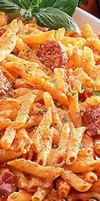 Ingredientes: 200 grs. de macarrones, 150 grs. netos de tomate, 80 grs. netos de chorizo magro, 200 grs. netos de jamón serrano magro, 30 grs. de queso parmesano rallado, sal, pimienta y 2 cucharadas de aceite de oliva.
