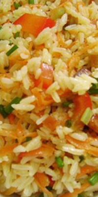 Ingredientes: 160 grs. de arroz, 120 grs. netos de tomates maduros, 60 grs. netos de pimiento verde, 1 ajo, 120 grs. netos de champiñón, 60 grs. netos de cebolla tierna, 260 grs. netos de jamón serrano magro, 1 huevo, 2 cucharadas de aceite de oliva, vinagre, mostaza, perejil y sal.