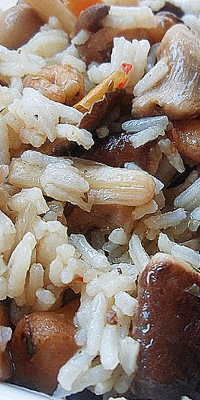 Preparación: Limpiar y trocear las setas en tiras finas. En una sartén con el aceite, freir los ajos y el jamon troceados y antes de que se doren, añadir las setas y que suelten su jugo durante 10 minutos. Agregar el arroz, dar unas vueltas y echar el agua (doble volumen). A media cocción añadir los guisantes, 1 cucharadita de curry y sal. Cuando este hecho, servir caliente.