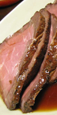 Preparación: Recortar los sobrantes del lomo y atar la parte central para darle buena forma. Poner los recortes en una fuente refractaria y colocar encima el lomo. Untar todo bien con un poco de aceite añadir las patatas y meter al horno durante 1/4 de hora. Dar vuelta, rociar con su propio jugo y dejar otro 1/4 de hora. Sacar del horno y partir en lonchas finas. Servir en una fuente caliente, con las patatas. Acompañar este plato con el pan correspondiente a cada ración.