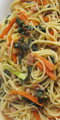 Ingredientes: 150 grs. de espaguetis, 160 grs. netos de calabacín, 140 grs. netos de tomate maduro, 50 grs. netos de cebolla, 2 dientes de ajo, 25 grs. netos de aceitunas verdes, 2 cucharadas medianas de aceite, 280 grs. netos de carne magra picada y 25 grs. netos de queso parmesano rallado.