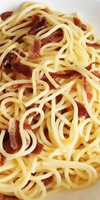 Ingredientes: 160 grs. de tallarines, 217 grs. netos de jamón serrano magro, 1 huevo, 2 dientes de ajo, 2 cucharadas de aceite, 1 cucharada de perejil y sal.