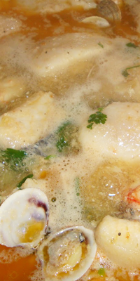 Ingredientes: 380 grs. netos de bacalao fresco, 100 grs. netos de pimiento rojo, 140 grs. netos de cebolla, 230 grs. netos de tomates maduros, 2 cucharadas medianas de aceite, 3 dientes de ajo y sal.