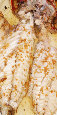 Ingredientes: 300 grs. netos de besugo, 480 grs. netos de patatas, 2 rodajas de limón, 2 cucharadas medianas de aceite de oliva, 3 dientes de ajo, 15 grs. de pan rallado, sal y perejil.