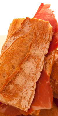 Preparación: Restregar el pan con tomate natural y rellenarlo con el jamón serrano sin grasa, en lonchas finas.