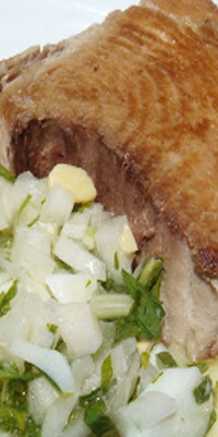 Ingredientes: 340 grs. netos de bonito, 2 cucharadas medianas de aceite de oliva, 4 cucharadas de vinagre, 300 grs. netos de cebolla y sal.