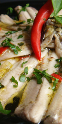 Preparación: Limpiar los boquerones, abrir y quitarles la espina. Asar los pimientos o sustituirlos por otros de lata. Hacer un picadillo con las cebollas, los ajos, el perejil y la guindilla. Poner en una cazuela una capa de boquerones espolvorearlos con sal, pimienta, pimentón y azafrán, y añadir un chorrito de vino blanco. A continuación poner una capa de picadillo. Alternar las capas. Tapar y dejar cocer a fuego lento. Servir acompañado de las patatas asadas.