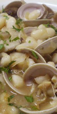 Ingredientes: 160 grs. de alubias blancas (fabes), 250 grs. netos de almejas, 90 grs. de cebolla, 2 dientes de ajo, 2 cucharadas de aceite de oliva y sal.