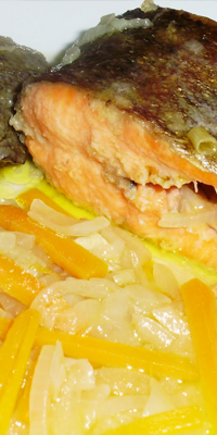 Ingredientes: 400 grs. netos de truchas, 240 grs. netos de cebolla, pimienta en grano, laurel, 15 cucharadas de vinagre, 2 cucharadas medianas de aceite, 160 grs. de pan blanco, pimienta y sal.