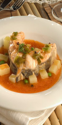 Ingredientes: 400 grs. netos de congrio abierto, 30 grs. netos de zumo de limón, 2 cucharadas de aceite, 180 grs. netos de tomate, 150 grs. netos de cebolla, 3 dientes de ajo, pimienta y sal.