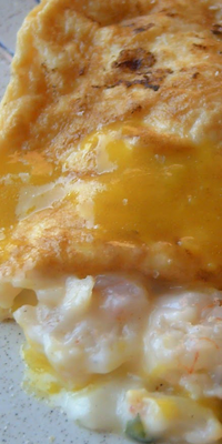 Preparación: Asar el pimiento, pelarlo y cortarlo en tiras gruesas. Majar en el mortero los ajos y el perejil. Hacer 1 tortilla a la francesa. Colocarla sobre una fuente. Mezclar la salsa de tomate con el majado y los pimientos. Dejar que dé un hervor. Echar sobre la tortilla, adornar con las gambas y servir. Acompañar este plato con el pan correspondiente a cada ración.