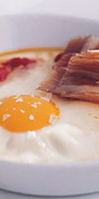 Preparación: En un cazo con agua y un chorro de vinagre, escalfar los huevos. Colocarlos en platos individuales con el jamón cortado a tiritas y adornarlos con el tomate. Acompañar este plato con el pan correspondiente a cada ración.