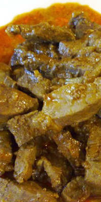 Ingredientes: 400 grs. netos de hígado de ternera, 12 grs. netos de harina, 190 grs. netos de cebolla, 1 copa de coñac, 2 cucharadas de aceite y sal.