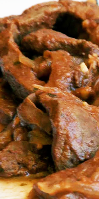 Preparación: Sazonar el hígado, pasarlo por harina y freirlo. Ponerlo en una cazuela y reservar. En el mismo aceite freir la cebolla previamente picada; cuando esté dorada, volcarla sobre el hígado, añadir un poco de agua y sazonar. Dejar cocer durante unos 15 minutos, moviendo de vez en cuando, hasta que espese la salsa y el hígado esté hecho. Acompañar este plato con el pan correspondiente a cada ración.