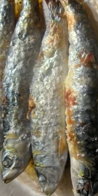 Preparación: Picar la cebolla en arros y ponerla en una fuente de horno, colocar las sardinas pasadas por la harina sobre la cebolla y poner por encima el aceite y la copa de vino. Dejar hasta que estén en su punto y servir. Acompañar este plato con el pan correspondiente a cada ración.