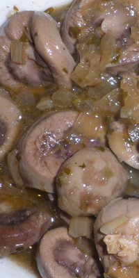 Ingredientes: 400 grs. netos de riñones de ternera, 600 grs. netos de patatas, 1 cucharada de aceite de oliva, 165 grs. netos de cebolla, 2 dientes de ajo, pimentón picante, nuez moscada, sal y pimienta.