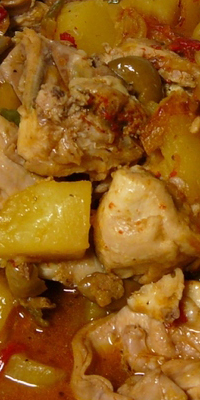 Ingredientes: 400 grs. netos de conejo, 400 grs. netos de patatas, 150 grs. netosde cebolla, 4 dientes de ajo, 2 cucharadas medianas de aceite, 1 vasito de vino blanco, pimienta negra y sal.
