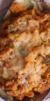 Ingredientes: dos berenjenas que en total pesen 800 grs., 155 grs. netos de cebolla, 50 grs. netos de pasas de corinto, 100 grs. de carne magra de pollo picada, 100 grs. de carne magra de pavo picada, 24 grs. de harina de maíz, 200 grs. de leche desnatada, 2 cucharadas de aceite de oliva, sal, nuez moscada y canela en polvo.
