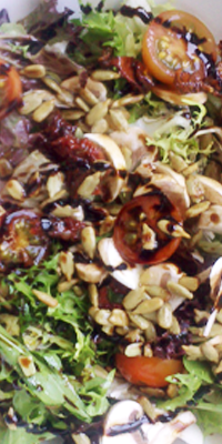 Ingredientes: 150 grs. de lechugas variadas, 150 grs. de tomates, 3 tomates secos en aceite, 100 grs. de champiñones, 30 grs. de levadura de cerveza en copos, 30 grs. de lomo embuchado magro, 20 grs. de aceite de oliva, 40 grs. de pan de centeno, sal, vinagre balsámico de Módena.