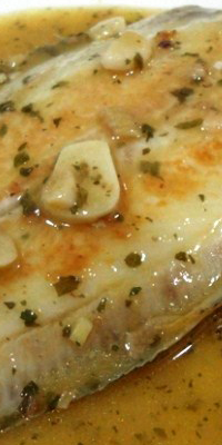 Ingredientes: 400 grs. de filetes de lenguado, 500 grs. netos de patatas pequeñas, 200 grs. netos de cebolla, 90 cc. de zumo de limón, 1 vasito de vino blanco, 15 grs. de pan rallado, 3 cucharadas de aceite y sal.