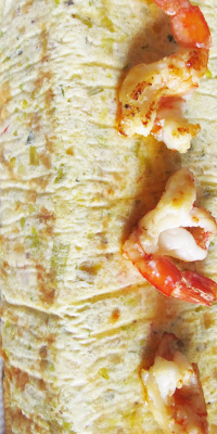 Ingredientes: 600 grs. de puerros, 200 grs. de gambas, 3 huevos grandes, 48 grs. de levadura de cerveza, 250 grs. de pan integral, 2 cucharadas de aceite y sal.