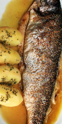 Preparación: Limpiar las truchas y sazonar. Untar una fuente de horno con el aceite. Poner las truchas en la fuente, rociarlas con el vino y el limón y meter a horno medio hasta que estén en su punto (aproximadamente 15 minutos). Servir en la misma fuente, adornádolas con ramitas de perejil. Acompañar este plato con el pan correspondiente a cada ración..