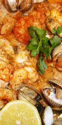 Ingredientes: 70 grs. netos de bonito, 80 grs. netos de merluza, 100 grs. netos de calamares, 80 grs. netos de gambas, 90 grs. netos de almejas, 1 guindilla, 150 grs.netos de tomate, 150 grs. netos de cebolla, 1 vaso de vino blanco, 1 copa de coñac, 3 cucharadas de aceite, 4 dientes de ajo, 200grs. de pan integral, laurel, tomillo, pimienta y sal.