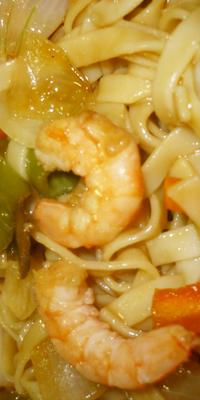 Preparación: Cocer los tallarines con agua, sal y un poquito de aceite. Una vez cocidos pasar por agua fría. Saltear las gambas picadas en una sartén, añadir los tallarines, sal, pimienta y rehogar 5 ó 6 minutos. Espolvorear el queso rallado por encima y servir.