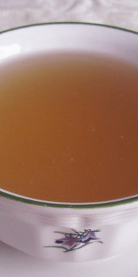 Ingredientes: 40 grs. netos de gallina sin grasa, 1 esqueleto de pollo, 200 grs. de cebolla, 100 grs. de zanahorias, 200 grs. de puerros, 50 grs. de apio, 1 cucharilla de aceite, 4 cucharadas de jerez, laurel, tomillo y sal.