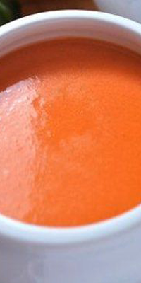 Ingredientes: 500 grs. netos de tomate, 80 grs. netos de pimiento verde, 130 grs. netos de pepinos, 90 grs. netos de cebolla, 2 dientes de ajo, 30 grs. de pan blanco, 75 grs. netos de jamón serrano magro, 1 cucharada de aceite de oliva, vinagre y sal.