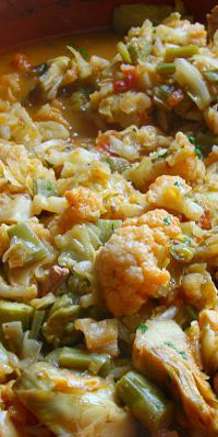 Preparación: Limpiar las verduras y trocearlas, picar la cebolla y el ajo y dorar en una cazuela con el aceite. Añadir el chorizo y el jamón troceados. Cuando tome color, retirar del fuego y añadir el pimentón. Volver al fuego y agregar 2 l. de agua, echar las verduras, la sémola y el laurel. Sazonar, tapar y dejar cocer a fuego lento 60 minutos, (20 en olla a presión).