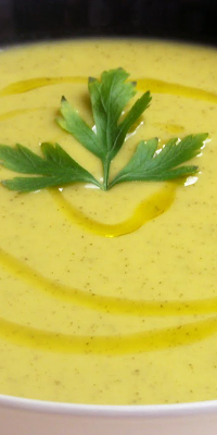Ingredientes: 600 grs. netos de calabacines, 200 grs. netos de patatas, 100 grs. de puerros, 1 cubito de concentrado de carne, 130 grs. de fiambre de pavo, 1 cucharada de aceite de oliva, 1cucharada mediana de aceite, perejil y sal.