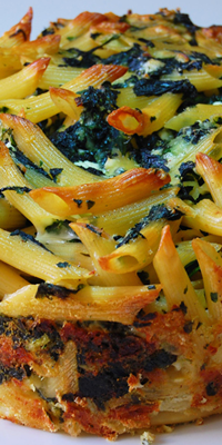 Preparación: cocer los macarrones con agua, sal. En una sartén, poner el aceite, freir los ajos picados y la cebolla rallada; antes de que se doren añadir la carne picada. Una vez sofrita, agregar los tomates pelados y triturados, hasta formar una pasta uniforme. Verter el vino, sazonar y revolver. En una fuente de horno, poner la pasta, la fritura de la sartén y los huevos batidos, mezclando bien. Cubrir con queso rallado y meter al horno 15 minutos hasta que cuaje el pastel.