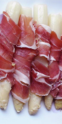 Preparación: Limpiar los espárragos y cocerlos en agua y sal a fuego medio. Cuando estén tiernos, sacar, escurrir con cuidado y colocar en una fuente, haciendo manojos y envolviéndolos en las lonchas finas del jamón. Servir fríos o templados, con la salsa mahonesa mezclada con el yogurt y el limón. Acompañar este plato con el pan correspondiente a cada ración.