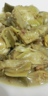 Preparación: Limpiar las alcachofas, partirlas en 4 trozos, frotarlas con limón y hervirlas con abundante agua y sal, 20 minutos. En una sartén, con la mitad del aceite, saltear la carne y reservar. En la misma sartén, sofreir la cebolla picadita y reservar. Añadir el resto del aceite y hacer una bechamel. Agregar las alcachofas, la cebolla, los guisantes y la carne, dejar cocer 10 minutos más, sazonar al gusto y servir.