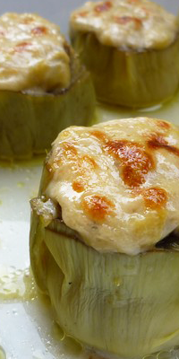 Preparación: Limpiar las alcachofas y partirlas en 2 trozos y frotarlas con el limón. Cocerlas en agua con sal, durante 20 minutos. Escurrirlas y ponerlas en una fuente de horno untada con un poco de aceite, todas hacia arriba. Poner encima de cada mitad trocitos de lomo muy picadito y distribuir el queso rallado. Meterlas a gratinar y servir calientes.