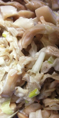 Ingredientes: 400 grs. netos de calabacín, 300 grs. de espárragos, 300 grs. netos de champiñones, 300 grs. netos de cebolla, 40 grs. netos de navajuelas, 1 cucharada de aceite de oliva y sal.