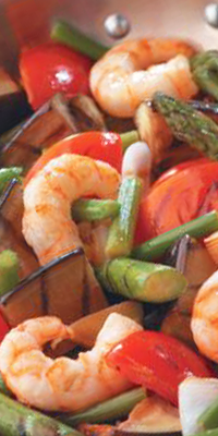 Ingredientes: 400 grs. netos de berenjena, 300 grs. netos de espárragos, 300 grs. netos de champiñones, 280 grs. netos de cebolla, 40 grs. netos de colas de gamba, 1 cucharada de aceite de oliva y sal.