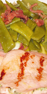 Ingredientes: 650 grs. netos de judías verdes, 180 grs. netos de cebolla, 60 grs. netos de lomo embuchado magro, 1 cucharada mediana de aceite de oliva y sal.