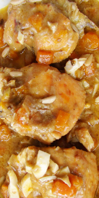 Preparación: Partir en trozos el pollo y sazonarlos con sal y nuez moscada en polvo. Dejar reposar 1 hora. A continuación, freirlos y colocarlaos en una cazuela. Picar la zanahoria y el puerro muy menuditos y rehogarlos. Cuando estén tiernos, sacar y reservar. Dorar la rebanada de pan en el mismo aceite. Cocer el huevo. Triturar con la batidora el sofrito, el pan, la yema de huevo y las almendras. Verter la mezcla sobre lel pollo cubrir de agua, sazonar y dejar cocer a fuego lento, hasta que esté tierno. Al servir, adornar la fuente con la clara de huevo picada. Acompañar este plato con el pan correspondiente a cada ración.