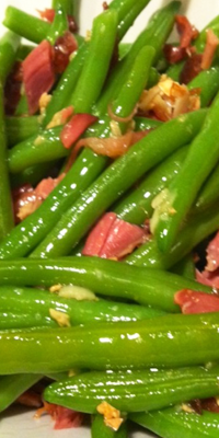 Ingredientes: 600 grs. netos de judías verdes, 160 grs. netos de cebolla, 60 grs. netos de jamón serrano magro, 2 cucharadas medianas de aceite de oliva, sal y pimienta.