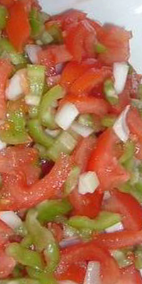 Ingredientes: 600 grs. netos de tomates, 200 grs, netos de pimientos verdes. 270 grs, netos de cebollas, 100 grs. de fiambre de pollo light, 24 grs. netos de alcaparras, 1 cucharada mediana de aceite de oliva, vinagre y sal.