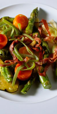 Ingredientes: 120 grs.netos de habas frescas o congeladas, 200 grs. netos de judías verdes, 220 grs. netos de jamón serrano magro, 100 grs. netos de cebolla, 125 grs. netos de macarrones finos, 90 grs. netos de tomate, 90 grs. de tomate, 2 cucharadas de aceite de oliva, vinagre y sal.