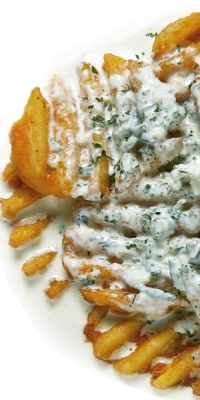 Ingredientes: 600 grs. netos de patatas, 190 grs. netos de colitas de gamba, 70 grs. netos de yogur natural desnatado, 80 grs. netos de queso azul, 5 grs. de perejil y sal.