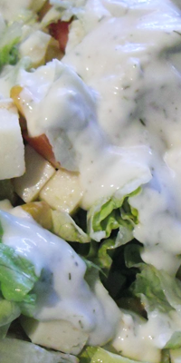 Ingredientes: 400 grs. netos de patatas, 220 grs. netos de pepinos, 2 yogures desnatados, 140 grs. netos de cebolla fresca, 250 grs. de lechuga, 420 grs netos de queso fresco light, 2 dientes de ajo, 1 cucharada de aceite de oliva, vinagre, sal y pimienta.