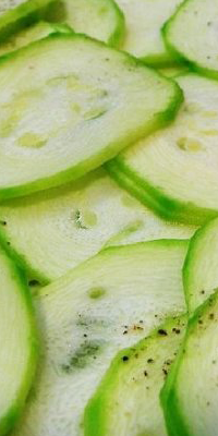 Partir el calabacín en rodajas finas. Poner en el microhondas 3 min. a la máxima potencia. En una sartén sofreir dos dientes de ajos, agregar los tacos de jamón, añadir el calabacín junto a 3 cucharadas de tomate natural y orégano, agregar un poco de agua y mantener 3 min. Rociar/pulverizar ligeramente con aceite de oliva en espray. Servir caliente.