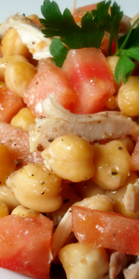 Ingredientes: 400 grs. netos de garbanzos cocidos, 200 grs. netos de pollo, asado o cocido, 150 grs. de tomate, 80 grs. netos de cebolla fresca, 1 cucharada de pipas de girasol, 1 cucharada de perejil, 1 diente de ajo, pimienta, comino, vinagre y sal. Rociar/pulverizar ligeramente con aceite de oliva en espray.